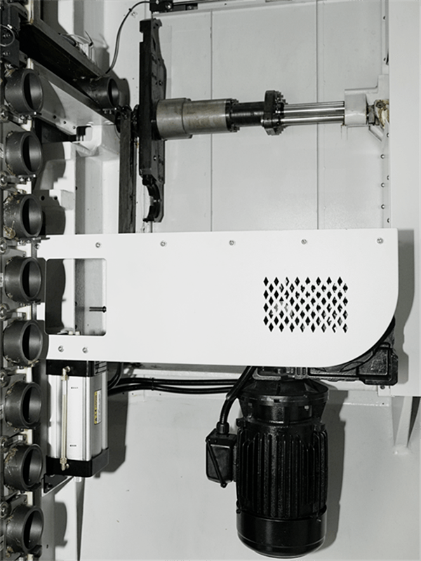 標(biāo)配40把伺服刀庫,凸輪機(jī)械手與刀庫門實(shí)現(xiàn)聯(lián)動控制,換刀時(shí)間2.5s。